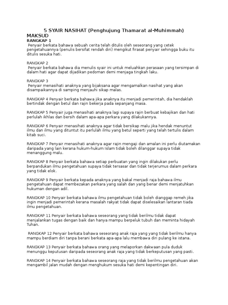 Syair Nasihat Penghujung Thamarat al-Muhimmah K. Apakah tema syair nasihat penghujung Thamarat Al-Muhimmah. Rangkap 1Penyair telah tamat mengarang kitab supaya dapat dijadikan SYAIR NASIHAT Penghujung Thamarat at-Muhimmah Melepaskan hati yang terbuku pengajaran kepada sekalian anakku mudah-mudahan betul tingkah dan laku perangai yang baik biar terpaku.